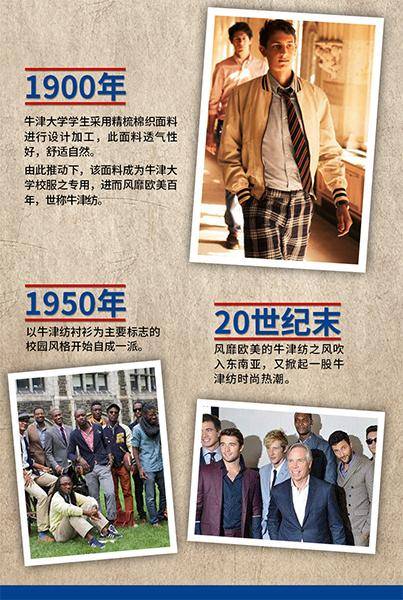 1900年,为对抗当时浮华奢靡的衣饰风气,牛津大学一小撮特立独行的学生,自行采用精梳棉织面料,进行设计加工,便有了牛津纺衬衫的雏形。此面料呈双色效应,色泽调和文静,透气性好,舒适自然。后来,该面料成为牛津大学校服的专用面料,久而久之,牛津纺衬衫成为学院风代表,后逐渐被全球时尚圈所接纳,世称牛津纺。
